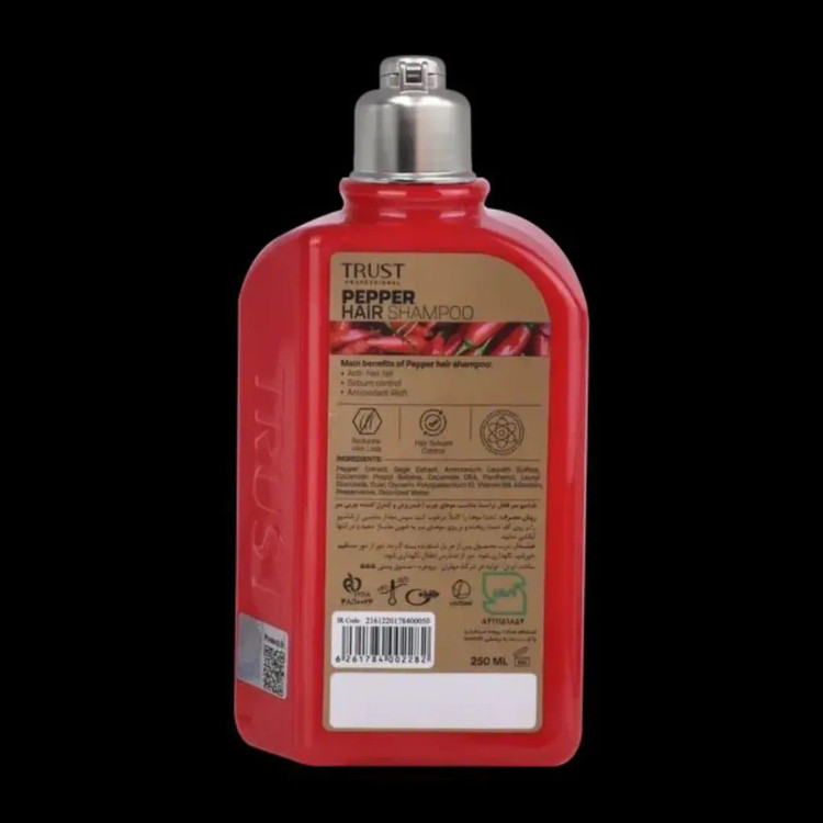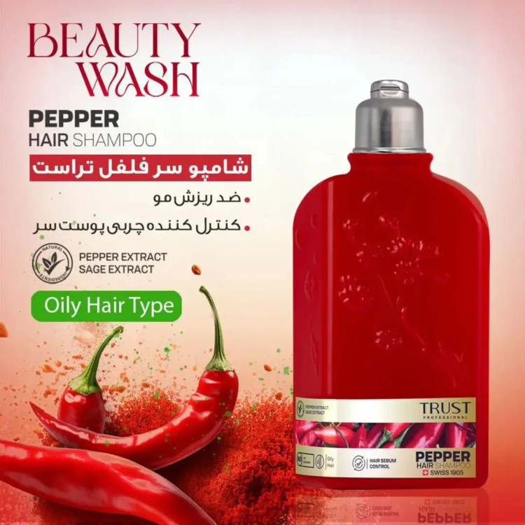 شامپو ضدریزش تراست با عصاره فلفل با ترکیب منحصربهفردش چربی پوست سر رو متعادل میکنه و فولیکولها رو برای رشد دوباره بیدار نگه میداره. عصاره فلفل برای تحریک جریان خون و تقویت ریشه مو کنترل ریزش مو و کمک به ضخیمتر شدن تارها متعادلکردن چربی پوست سر؛ مخصوص موهای چرب فاقد سدیم لوریل سولفات و پارابن برای شستوشوی ملایم و ایمن.