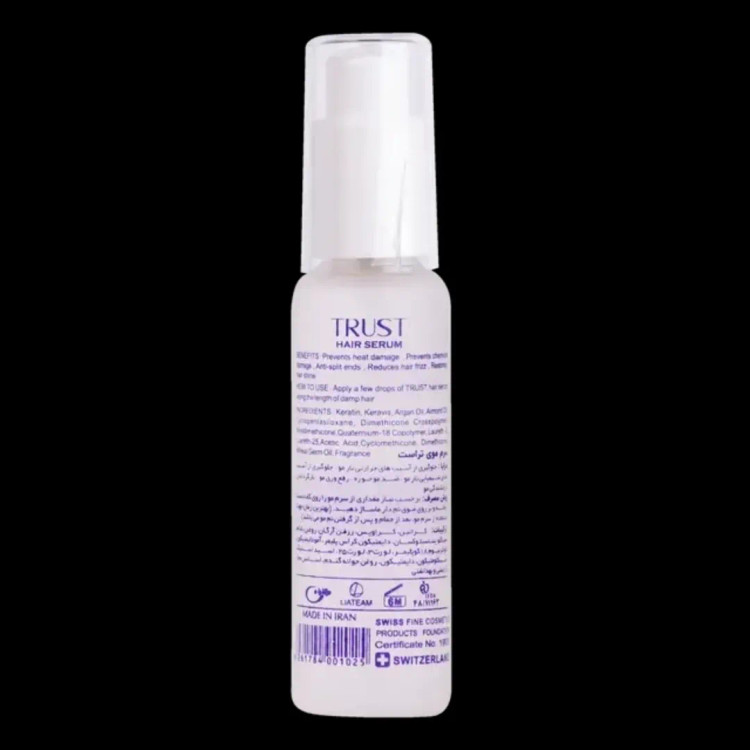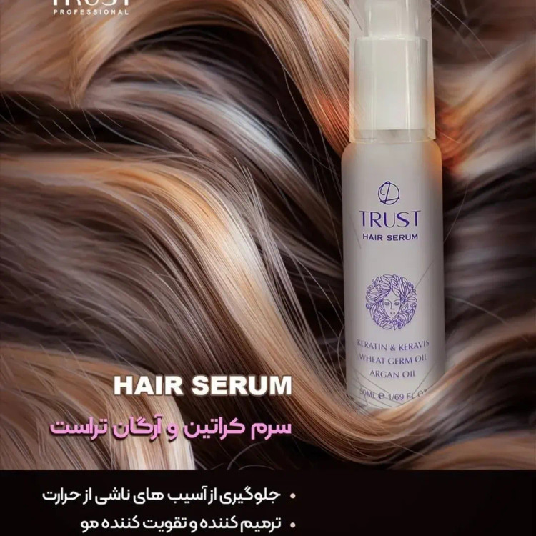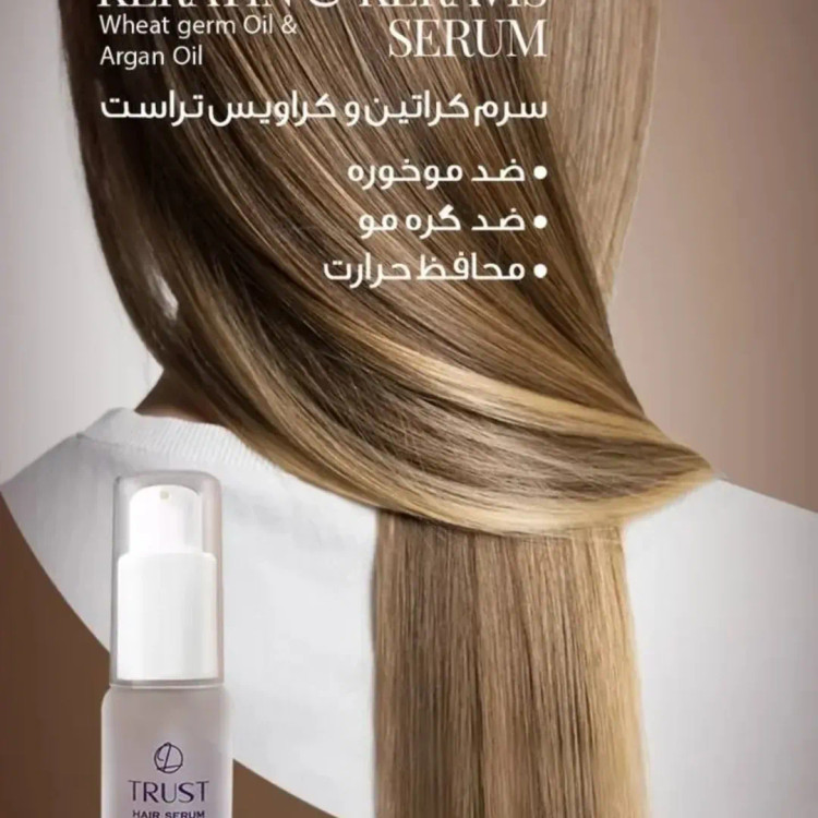 روتین کامل برای موهای درخشان. این سرم یه نجاتدهندهست. چند قطره از سرم کراتین و آرگان تراست کافیست تا تارهای مو رو تقویت و نرم کنه، جلوی موخوره و وز شدن رو بگیره، موها رو از حرارت سشوار و اتو در امان نگه داره، رطوبت و شفافیت طبیعی رو برگردونه و موهات رو براق و خوشحالت نشون بده.