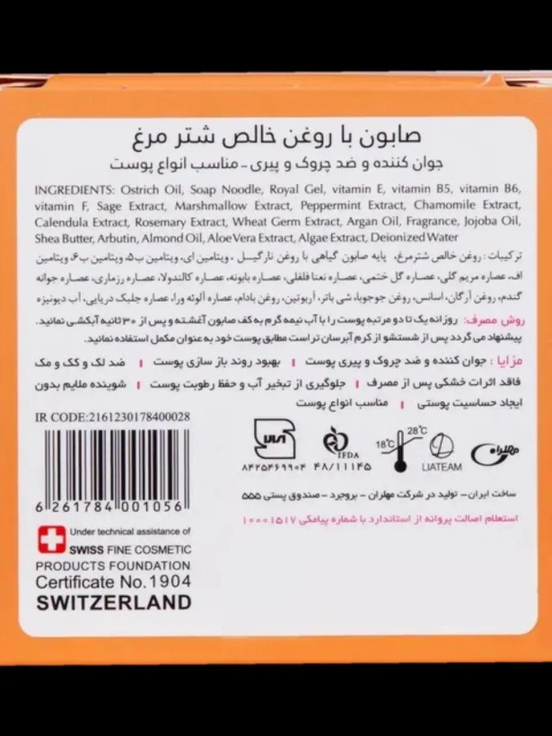 بازسازی، روشنکنندگی و جوانی در هر شستشو! قدرت ترمیمکنندگی روغن شترمرغ، حالا توی یه صابون لوکس و مغذی! هر بار شستشو یعنی یه قدم به سمت پوست روشنتر، نرمتر و جوانتر جذب عمیق، آبرسانی واقعی و بازسازی سلولی که لکها رو کم میکنه و شادابی رو برمیگردونه بده تا پوستت دوباره مثل روزای اولش بدرخشه